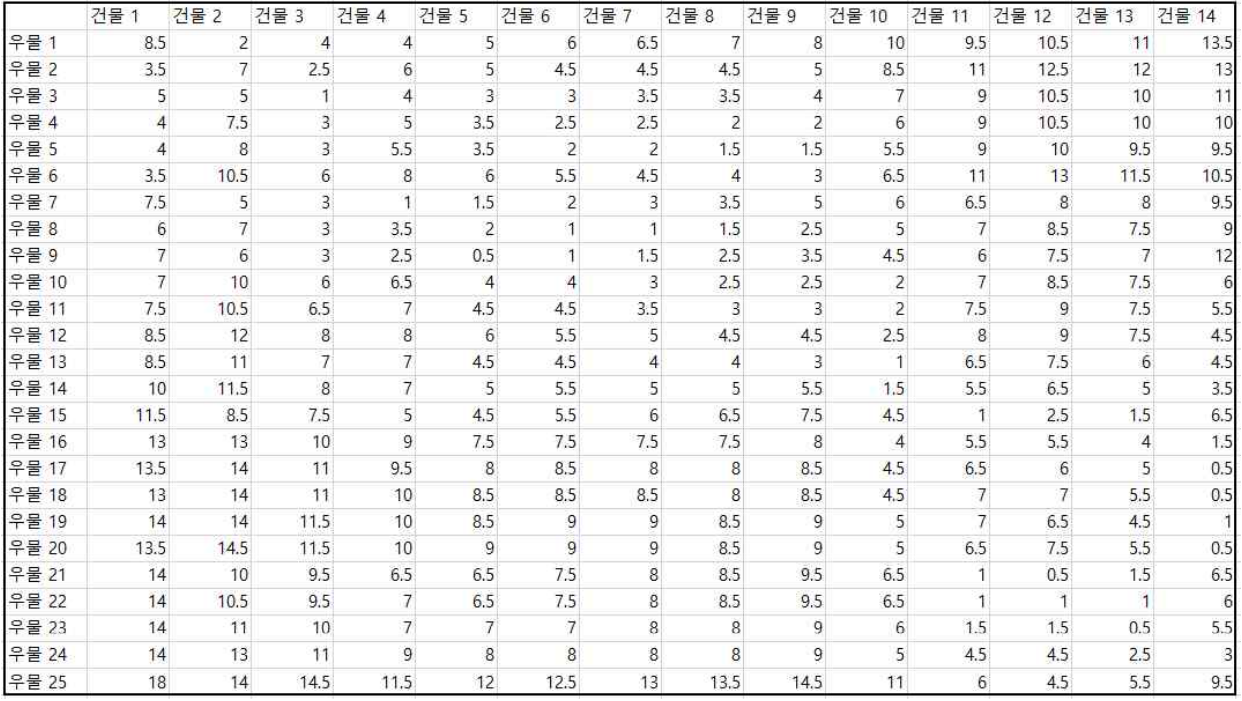 ③ 건물당 편도 1분 이내인 우물이 적어도 2개 이상 있어야 하는 경우는 최적해를 찾을 수 없다고 나온다. 1.5분, 2분의 경우를 시도해보아도 마찬가지였다. 이때 해 찾기 프로그램에서 1분의 제약조건 충족에 그나마 가까운 해를 찾은 결과를 보면 우물 3, 5, 7, 8, 9, 13, 14, 16, 17, 21, 22의 11개가 필요하였고 이때 건물 1, 2는 1분 내 도달 가능한 우물이 각각 0개, 건물 3, 4, 9는 각각 1개로 제약조건에 어긋남을 알 수 있었다.