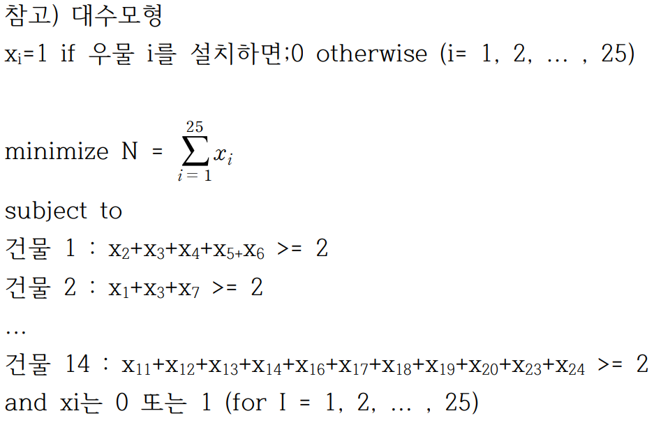 이를 이용하여 이진정수계획법 모형을 구성하면 목적식은 필요한 우물 개수의 최소화이다. 우물 건설에 필요한 비용을 알았다면 비용의 최소화로 두어도 좋겠지만, 우물 건설 비용에 대한 자료가 부족하여 우물 건설 개수로 대신하는 것이다. 의사결정변수는 우물의 존재 여부이며, 제약조건은 각 건물마다 우물이 적어도 두 개는 n분 내의 거리에 위치해야 한다는 것이 있다. n은 1, 3, 5를 각각 넣어 계산해보고 필요할 경우 추가적인 계산도 시행할 것이다. n을 하나로 정하여 풀지 않는 이유는, 직선거리임을 고려하여 시간적인 제약조건을 강하게 잡았으나 다소 임의적인 설정이므로 여러 제약조건의 경우를 고려하려는 것이다.