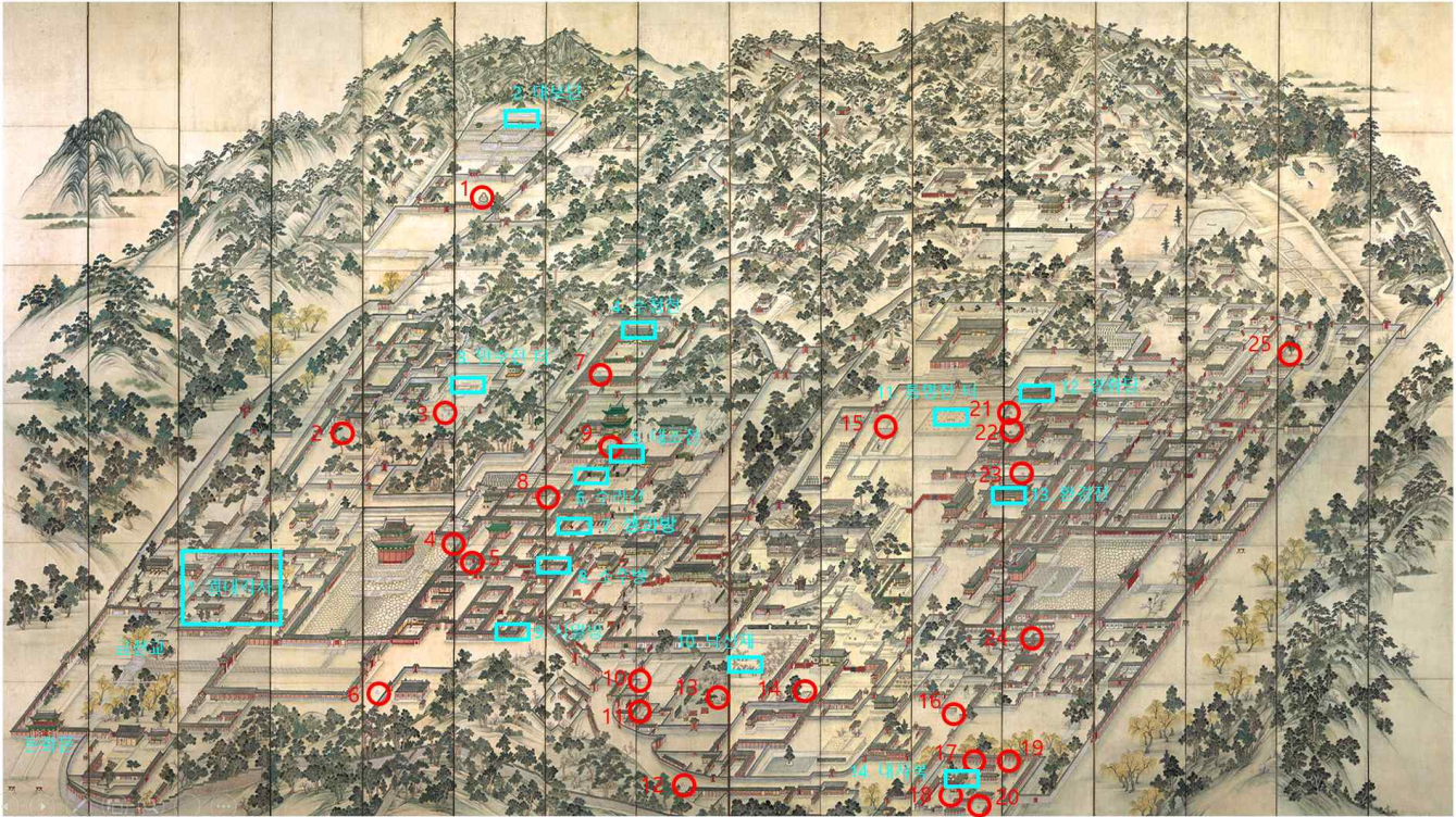 동궐도에 그려진 우물을 전부 표시하자 총 25까지 임의로 번호를 붙일 수 있었다. 우물들은 궁궐 전반에 분포하고 있지만 몇몇 구역에 집중적으로 몰려 있는 양상을 보이기도 하였다. 이어서, 물의 사용은 왕실 구성원의 생활 공간, 궁녀의 일터, 각신들의 업무 공간에서 많이 이루어질 것이라고 가정하여 궁궐 내에서 물의 사용이 잦을 공간을 같은 지도에 표시해 보았다. 궐내각사, 대보단, 만수전 터, 수정전, 대조전, 수라간, 생과방, 소주방, 사알방, 낙선재, 통명 전 터, 양화당, 환경전, 내사복의 14개 건물 또는 건물터가 표시되었다. <그림 1>에서 빨간 원은 우물, 파란 사각형은 건물을 표시한 것이다.