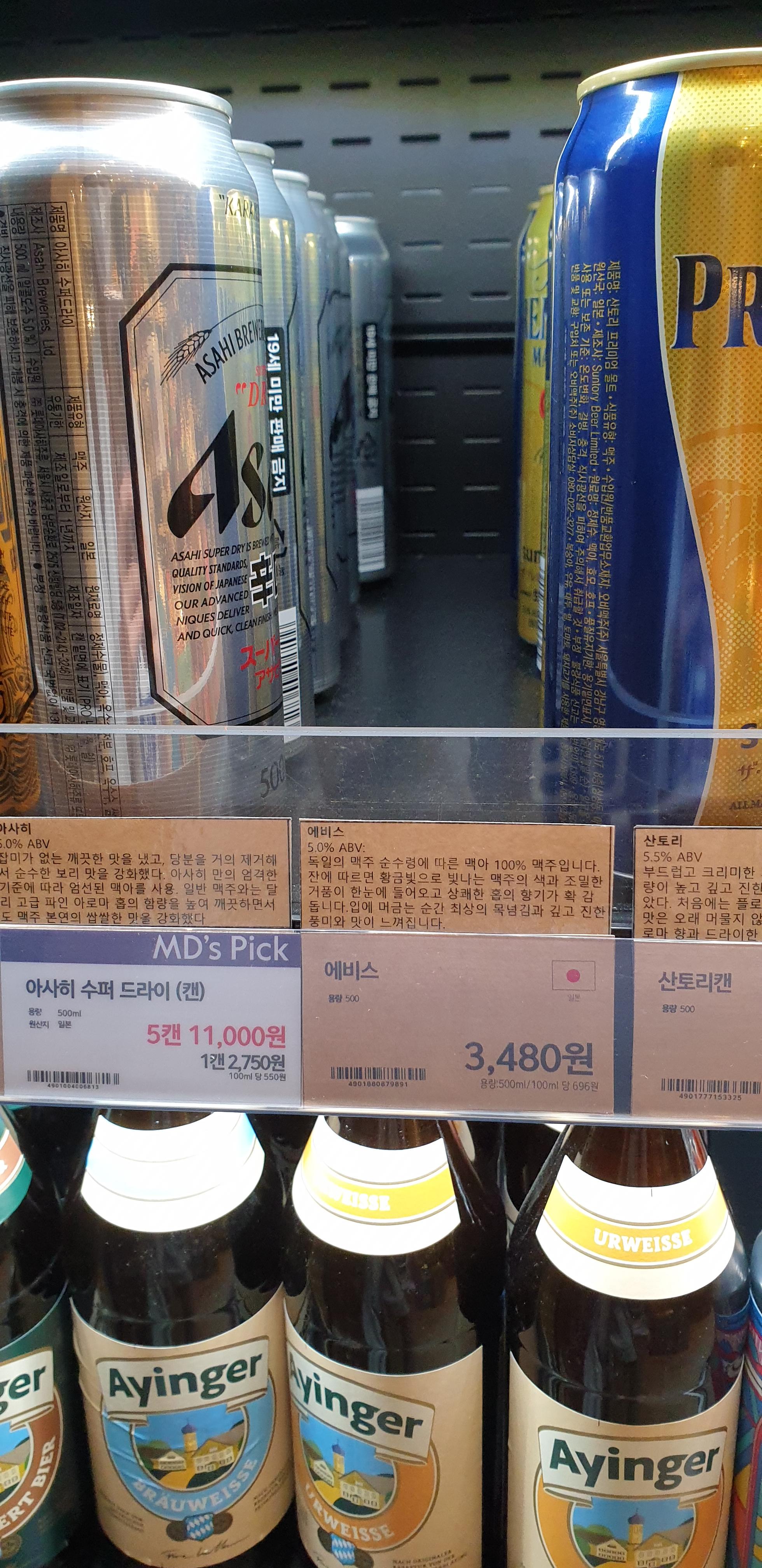 편의점에서 못보는 맥주들을 와앤모에서 자주 팔긴 하지만 보통 아예 이상한 맥주... 막 '나폴레옹 케이크맛 맥주', '피넛버터밀크스타우트' 이런 거를 판다. 따라서 에비스처럼 되게 유명하고 대중적인,, 하지만 편의점에선 잘 안파는,, 그런 맥주는 의외로 없던데,