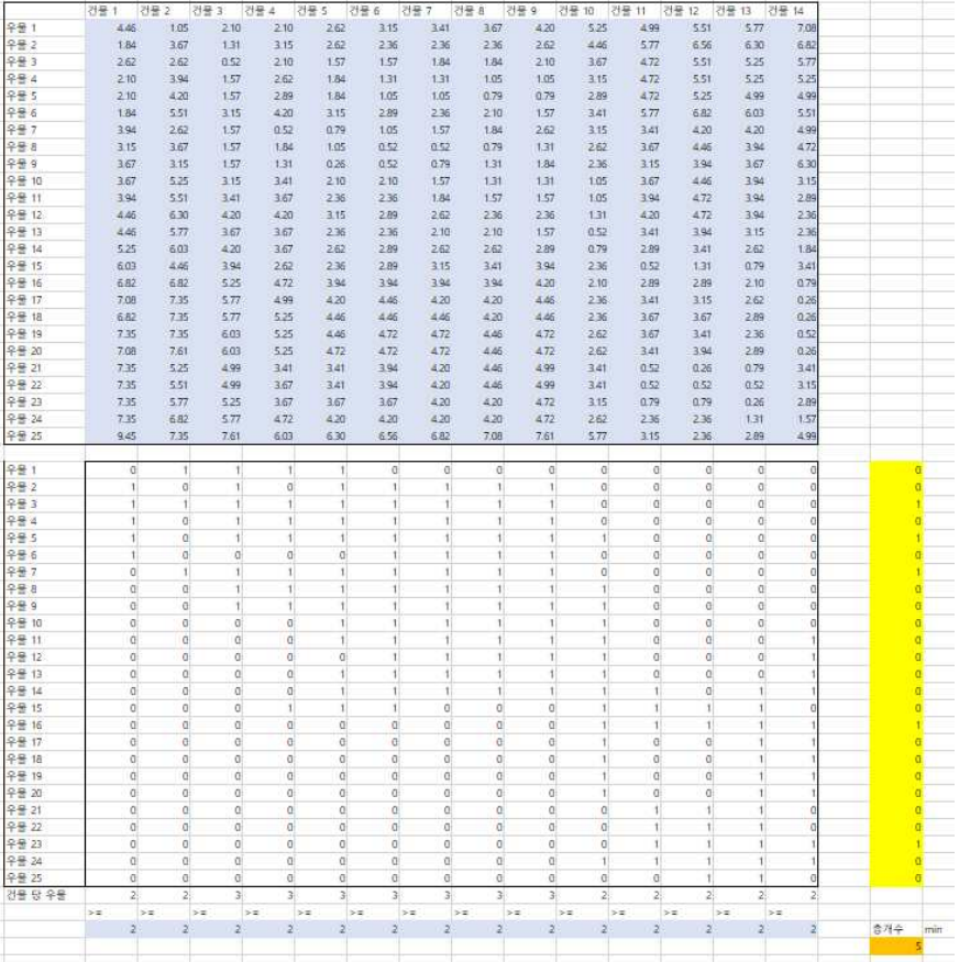③ 건물당 편도 1분 이내인 우물이 적어도 2개 이상 있어야 하는 경우는 최적해를 찾을 수 없다고 나온다. 1.5분, 2분의 경우를 시도해보아도 마찬가지였다. 이때 해 찾기 프로그램에서 1분의 제약조건 충족에 그나마 가까운 해를 찾은 결과를 보면 우물 3, 5, 7, 8, 9, 13, 14, 16, 17, 21, 22의 11개가 필요하였고 이때 건물 1, 2는 1분 내 도달 가능한 우물이 각각 0개, 건물 3, 4, 9는 각각 1개로 제약조건에 어긋남을 알 수 있었다.