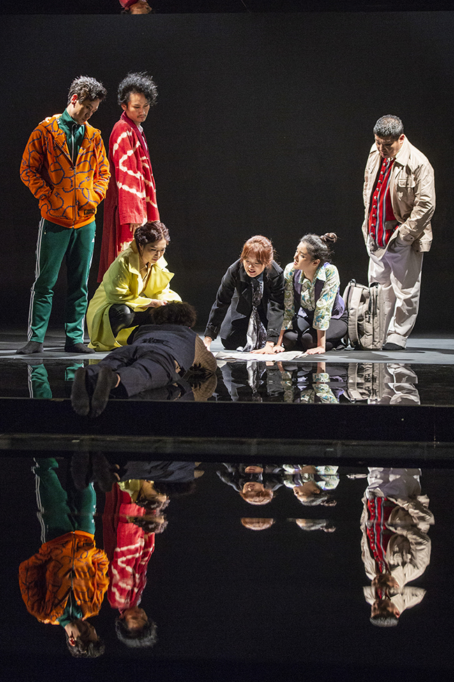 내레이션뿐만 아니라 대사를 하는 방식 또한 관객이 극 속 상황이 ‘진짜’라고 느끼지 못하게 만든다. 대사를 평범한 말하기 속도보다 느리게 말하기도 하고, 경망스럽다는 느낌을 줄 정도로 높은 음조로 말하기도 하며, 대사를 한 음절마다 끊어서 말하기도 한다. 즉 일상어에 비해 과장되어 있다. 또 ‘주인공의 존재를 부정하는 대사’처럼, 특별한 내용의 대사는 말할 때 다른 사람이 메아리를 넣듯이 말하기도 한다. 더 나아가 태풍 소리를 여러 배우가 입으로 만들어내는 장면에서는 ‘언어’는 사라지고, 배우들이 소리를 내고 있다는 것 자체가 중요해진다. 관객들은 저 소리가 무엇인지 이해하지 못한 채로 그저 기이함과 압도감을 느낄 뿐이고, 이어지는 대사를 듣고서야 태풍이 지나가는 장면이었다는 것을 유추할 수 있다. 언어의 내용보다는 그것이 주는 느낌이 강조되는 것이다. 연극이 텍스트를 기반으로 한 내용을 전달하는 것을 목적으로 하는 것이 아님을 보여준다. 이는 내용만이 아니라 형식적 기법을 함께 사용하는 것이, 주제를 전달하는 데에 더 효과적이기 때문이다.
