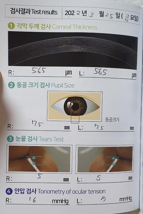 - 각막 두께 재는 검사 : 성인 여성 기준 520~530마이크로미터 이상이면 정상이라고 합니다.