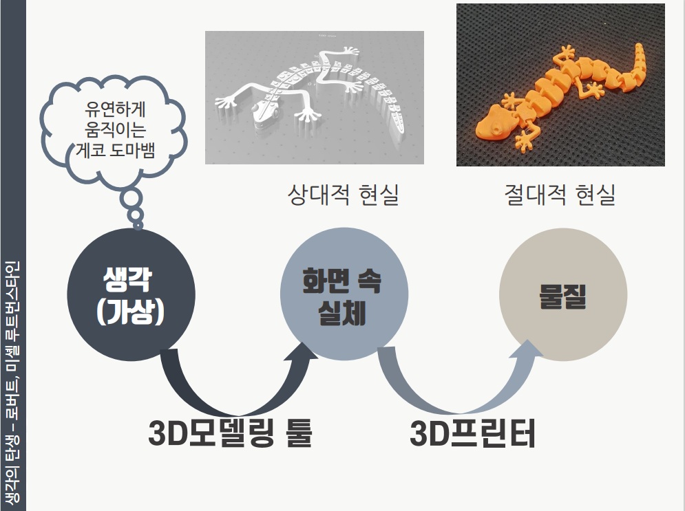 3D프린터는 생각을 말 그대로 물질로 구현하는 방식으로 ‘생각의 물질화’를 달성한다. 3D모델링 툴을 활용하여 생각을 동시적으로 ‘상대적 현실’인 화면 속 실체로 옮기고 3D프린터를 통해 이를 ‘절대적 현실’인 실물로 옮긴다. 사고의 13 기법 중 ‘모형 만들기’와 다른 점은, 3D프린터는 생각의 원천으로, 즉 인과관계에서의 원인으로 삼기 위한 실체화가 아니라 생각을 구현해내는 ‘결과론적인’ 실체화라는 점이다.