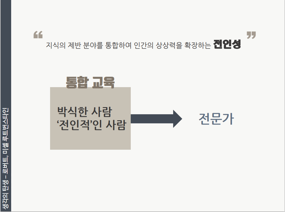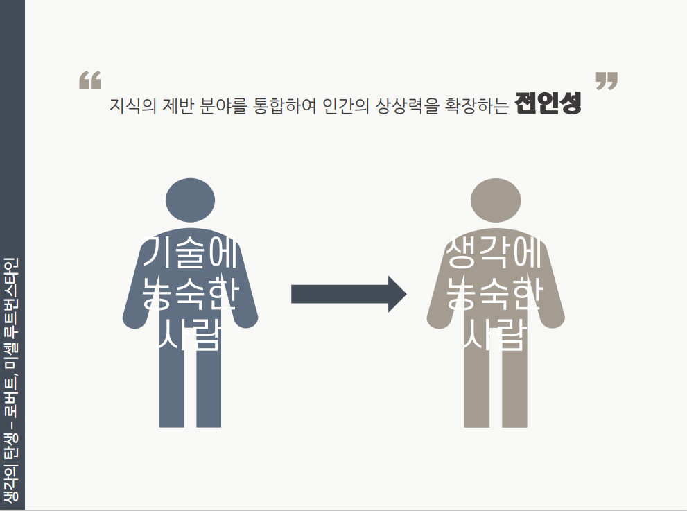 <생각의 탄생>책 말미에서는 창조적 사고를 직조하여 통합적 이해를 달성하기 위한‘통합교육’의 필요성을 강조한다.한 우물만 파는 방식의‘전문가가 되기 위한 교육’이 아닌, ‘전인성’을 달성하는 박식한 사람을 만드는 교육을 한다면 이를 통해 결국 전문가도 될 수 있다는 것이 저자들의 요지이다.그렇다면 앞에서 논의한 사항을 바탕으로 볼 때,저자들이 지향하는‘전인적 인간상’은 현대 사회에서는 어떤 양상으로 나타날지 확인할 필요가 있다.생각이 물질화된 영역으로 확장되어 전개된다는 관점에서 전인성의 개념 자체가 흔들리는 것은 아니다.다만 전인성을 획득하는 방법 측면에서‘현대 사회의 기술’이라는 요소를 보다 적극적으로 활용하는 것이 점차 중요해진다.기술의 영역에 능숙한 사람이 생각에도 능해지는 시대가 도래한 것이다.즉 소위‘MZ세대’라는 말로 일컬어지는 현대 사회의 젊은 층은 전인적 인간상에 도달하는 방식 자체가 다른 세대라고 할 수 있으며,이 시대의‘통합교육’도 그에 맞춰 달라져야 할 테다.